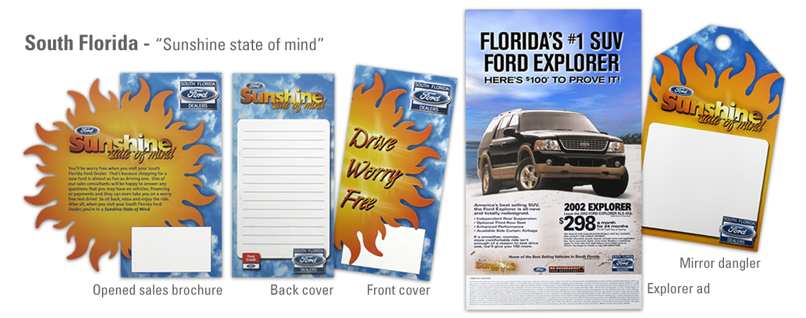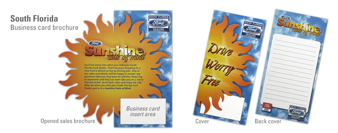 The sample below shows the personalized salesperson brochure that communicates the ease of doing business with a familiar tone. This brochure included a dye cut area for the sales persons’ business card and a blank area for notes about the vehicles that were shown, as a take-away for the customer.